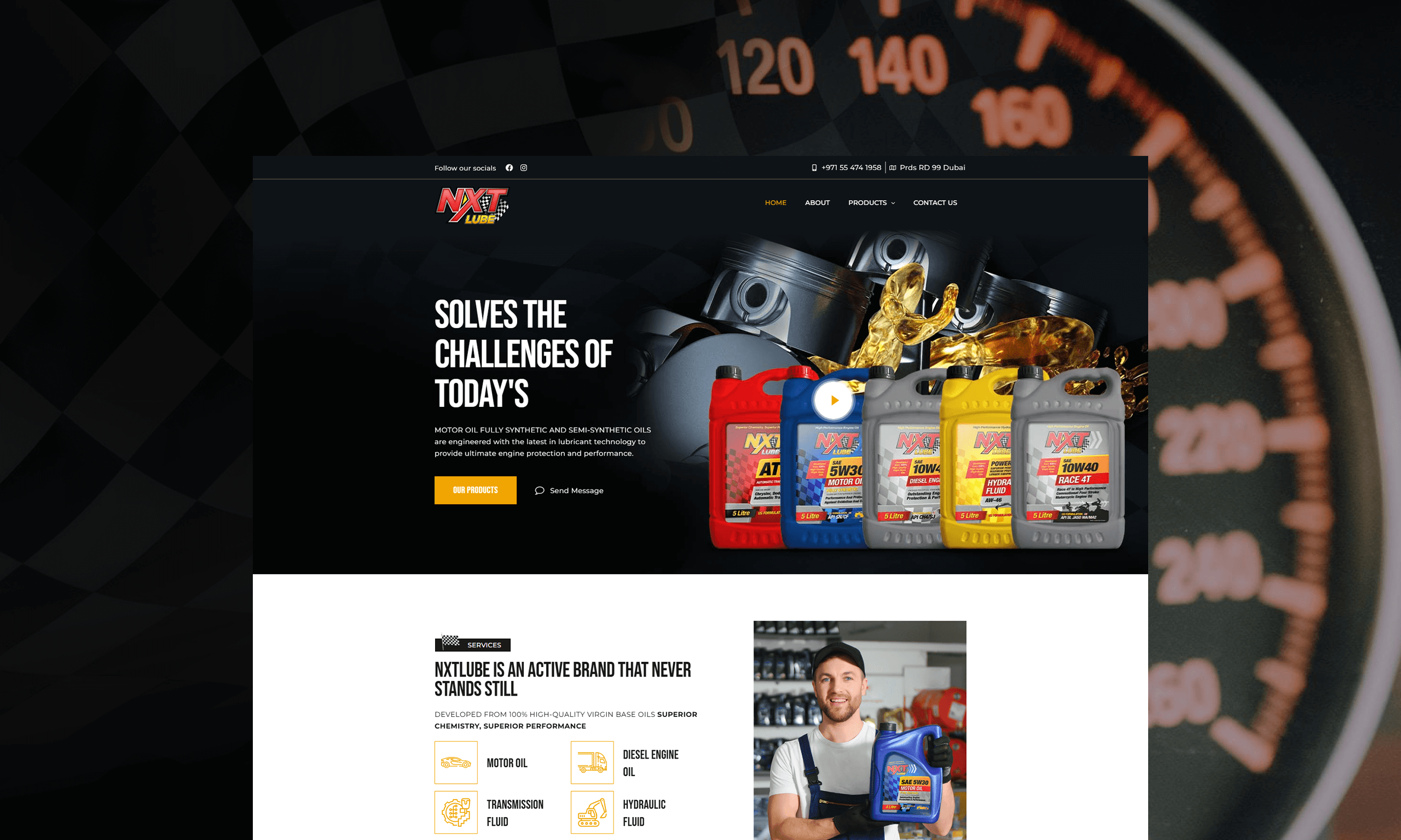 A bold, high-impact website for NXTLUBE — a premium lubricant brand serving small to large vehicles with advanced automotive solutions.